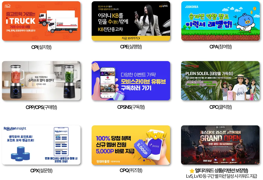 그린피 광고 상품: CPI(설치형), CPE(실행형), CPA(참여형), CPX(설문형), CPP/CPS(구매형), CPSNS(구독형), CPC(클릭형), CPQ(퀴즈형), 멀티 리워드(리텐션형)