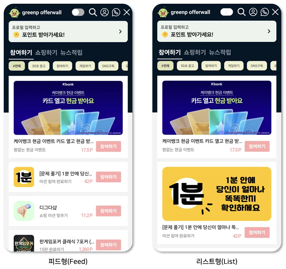 그린피 오퍼월 (SDK 연동/API 연동)은 통상적인 광고 상품의 제공 뿐만 아니라, 그린피 만의 광고 상품 제공으로 유저 참여를 극대화하고 있습니다.