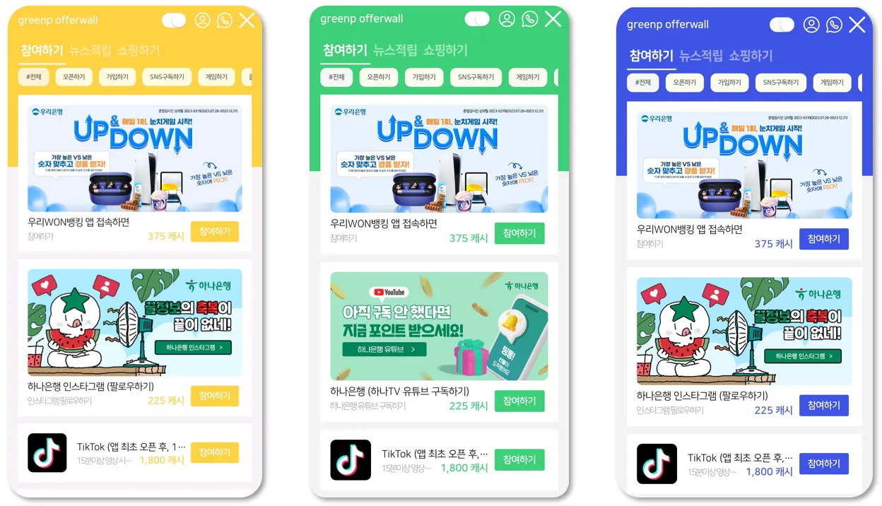 그린피 오퍼월(SDK 연동)은 매체사의 톤앤매너에 맞게 서버에서 실시간으로 원하는 색상코드를 입력하여 오퍼월 배경 컬러부터 버튼까지 다양한 커스터마이징이 가능합니다.